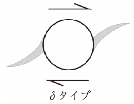マイロナイトなどの剪断を受けた岩石に見られる,ポーフィロクラストとプレッシャーシャドーやテイルが作る形態の一つ。剪断センスの判定に使われ,右ずれの場合にδを横倒しにしたような形態を作る。