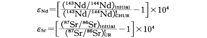 岩石のSr・Nd同位体比をε値で表しX-Y図にプロットしたもの。εNd・εSrはそれぞれ次式で表される。