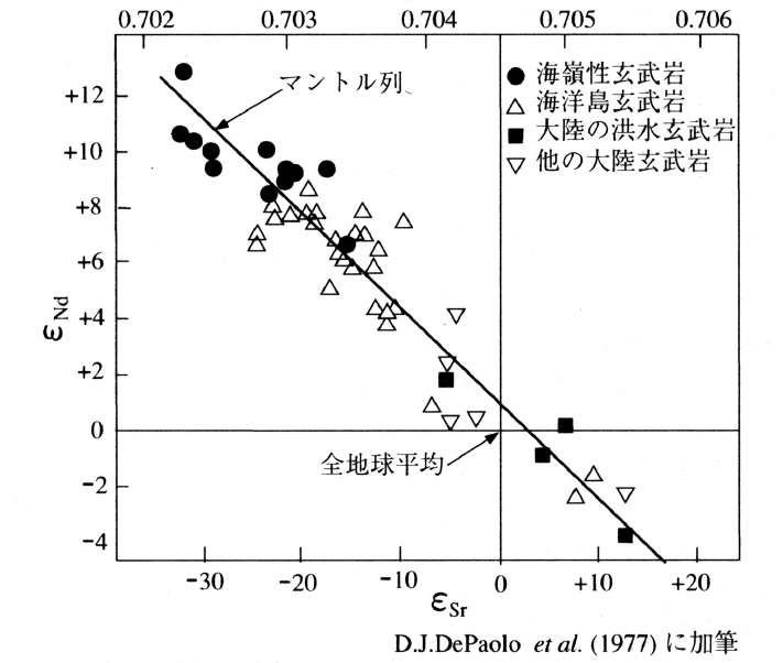 多くのマントル起原の岩石は,この図上で原点を通る負の勾配の線上にプロットされることから,D.J.DePaolo et al.(1976)はこれをマントル列と呼んだ。εNd-εSrプロットは岩石の起原物質の推定のみならず,マグマの混合,水-岩石相互作用など,多くの地球化学的プロセスの解釈に有効。