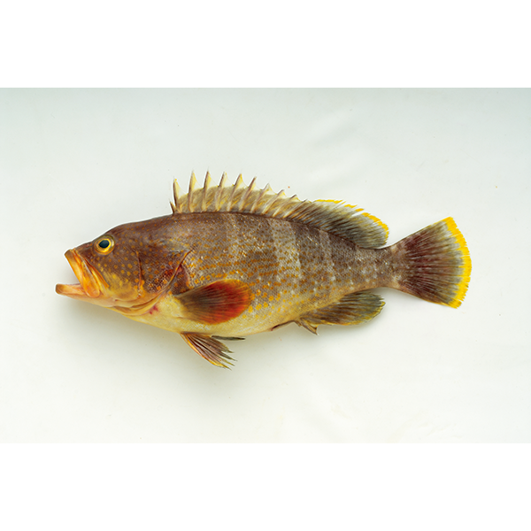 硬骨魚綱スズキ目ハタ科ハタ亜科ハタ族に属する海水魚。山形県以南の日本海沿岸、相模(さがみ)湾以南の太平洋沿岸、小笠原(おがさわら)諸島、朝鮮半島南岸、台湾、浙江(せっこう)省から広東(カントン)省の中国沿岸、南シナ海、フィリピン諸島、ベトナムの海域などに分布する。背びれ棘(きょく)が11本、臀(しり)びれ軟条数が通常8本のマハタ属に含まれる。体は楕円(だえん)形で、体高はほぼ中央部でもっとも高い。頭部の背縁は強い凸状。両眼間隔域は強く盛り上がり、間隔幅はおよそ眼径に等しい。前鰓蓋骨(ぜんさいがいこつ)はやや角張り、隅角(ぐうかく)部に2~5本の強い棘がある。主鰓蓋骨は背縁が直線状で、およそ等間隔に並ぶ3本の棘をもち、最上棘は退化的、中央棘は最大で、最下棘は中央棘より前に位置する。間鰓蓋骨と下鰓蓋骨の縁辺は円滑。口は大きく、下顎(かがく)は上顎よりも大いに突出する。主上顎骨の後端は目の後縁下に達する。上下両顎の先端の各側に1対(つい)の犬歯がある。下顎の中央部の歯は2列。鋤骨(じょこつ)(頭蓋床の最前端にある骨)と口蓋骨に歯帯がある。鱗(うろこ)は櫛鱗(しつりん)で小さい。背びれ棘部の鰭膜(きまく)は深く切れ込む。背びれ第3棘または第4棘が最長であるが、最長軟条よりも短い。尾びれの後縁は丸い。体色は黄灰色で腹面は黄金色。全体に多数の小さい黄色の円斑(えんはん)が散在する。体側に5本の褐色横帯があり、前の2帯は背びれ棘部から、次の2帯は背びれ軟条部から始まり、最後の1帯は尾柄(びへい)にある。前の4帯はそれぞれ背びれに侵入する。項部(背びれ起部より前の後頭部)に1帯がある個体もみられる。背びれ軟条部、尾びれ、臀びれの縁は黄色。沿岸性の魚で水深5~50メートルの岩礁域や砂泥底に生息する。稚魚は潮だまり(タイドプール)でみられる。攻撃的な魚で生け簀(す)の中では絶えず他の魚をかんだり、追いかけたりする。全長60センチメートルに達する。雌性先熟型(雌から雄へ)の雌雄同体魚。冬季に、日本海西部、済州島(さいしゅうとう)(韓国)近海などでは底引網でやや多量に漁獲され、刺身、煮つけなどにすると美味である。