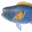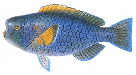 硬骨魚綱スズキ目ブダイ科に属する海水魚。東京湾から南西諸島(琉球列島)にかけての太平洋に分布する。体は楕円(だえん)形で一様に青いのが特徴だが、胸部、背びれおよび胸びれが朱色のものもいる。幼魚、若魚および老成魚では黒みが強い。成魚の雄では額(ひたい)がこぶ状に突き出る。上下両あごの歯は互いに癒合して嘴(くちばし)状になり、大部分がむき出る。背びれの前方の鱗(うろこ)は6枚。ほお部の鱗は2列に並ぶ。全長80センチメートルになる。サンゴ礁や岩場にすむ。昼は中層で数尾が群れをなし夜は岩場で休む。強い歯で造礁サンゴを骨格ごとかじりとって食べる。肉は白くてフライなどにするが、あまり美味ではない。内臓、とくに肝臓にはスナギンチャク類由来のフグ毒より強い猛毒パリトキシンが蓄積されていることがあり、注意が必要である。イシダイの外道(げどう)(狙っているもの以外の魚が釣れてしまうこと)として嫌われる。