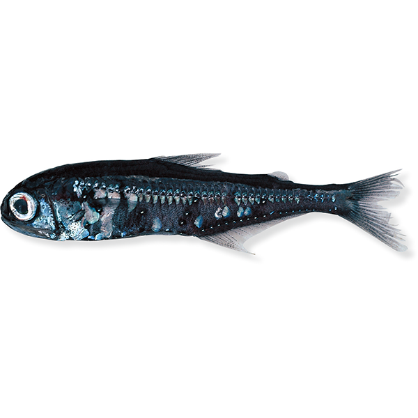 また、発光器は種の重要な特徴である。肛門(こうもん)上発光器SAO(図中⑫、以下同)は3個で、逆くの字状に曲がる。最上のものは側線直下に位置し、最下のものは3番目と4番目の腹部発光器VO(⑪)の間の上に位置する。腹部発光器は4個で、水平に並ぶ。腹びれ上発光器VLO(⑨)は中央の肛門上発光器とほとんど同一水平線上に位置する。胸びれ下発光器PVO(⑧)は2個で、斜めに並ぶ。胸びれ上発光器PLO(⑦)は胸びれ基底上端よりもかなり上方にある。体側後部発光器Pol(⑭)は1個で、側線のわずかに下の、脂びれの基底前方下にある。前部臀びれ発光器AOa(⑬)は普通は7個(6~8個)。後部臀びれ発光器AOp(⑮)は普通は6個(4~7個)で、1番目のものは臀びれ基底後端の上にある。尾びれ前発光器Prc(⑱)は2個で、尾びれ基底下の尾柄(びへい)にやや斜めに並ぶ。雄には4~6個の発光鱗からなる尾柄上部発光腺(せん)SUGL(⑯)があり、脂びれと尾びれの間の大部分を占める。雌には1~2個の小さい卵円形の発光鱗からなる尾柄下部発光腺INGL(⑰)がある。