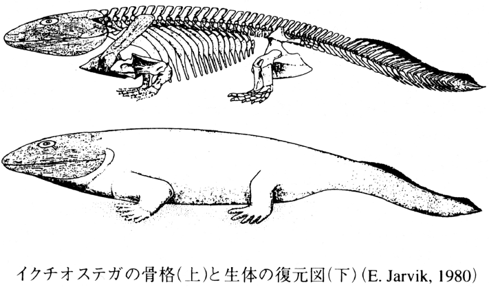 両生綱迷歯亜綱イクチオステガ目の基準属。グリーンランド東部の上部デボン系から産出した最古の両生類として知られる。全長65~100cm。頑丈な四肢と肋骨をもち,陸上を歩くことのできた両生類であるが,魚類の特徴もまだ残している。鰓蓋骨の一部(前鰓蓋骨と下鰓蓋骨)や側線管が残存し,椎骨は総鰭類と同様に未発達で,環状の椎体の中に脊索が太く残り,特に尾椎には鰭条が残っている。スウェーデンの古生物学者G.Säve-Söderbergh(1932)が記載し,E.Jarvik(1952, 80)によって詳しく研究された。