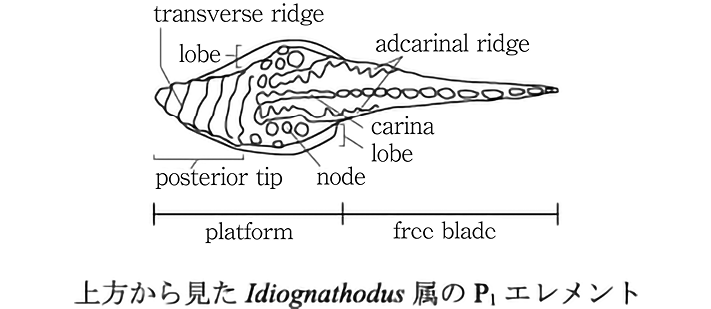 コノドントのオザルコディーナ目イディオグナソドンティナエ科に含まれる1属。主に上部石炭系の海成層から産出。採餌器官は15のエレメントからなる。くさび形やダイヤ型のプラットフォーム部と長いfree bladeからなるP1エレメントをもつ。プラットフォームの中央まで,free bladeから続く竜骨状突起(carina)が伸び,その両側面にはfree bladeに平行なadcarinal ridgeが発達する。側方のlobeには,多数のコブ状突起(node)がみられる。lobeの面積とコブ状突起の数は,基本的に個体の成長に伴って増加する。プラットフォーム後方部(posterior tip)には,畝