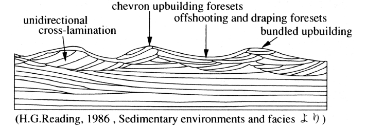 振動流(波)によりつくられるリップル。丸い谷と対称性の高いとがった峰とが規則的に繰り返す。横断面ではクレストに対して対称的。平面では峰線が直線的で平行に並ぶが,ところどころ枝分れしたり,うねったりする。波の振動方向に直交する断面ではchevron upbuilding foresetsや,offshooting and draping foresetsなどの特徴的な内部堆積構造を示す。