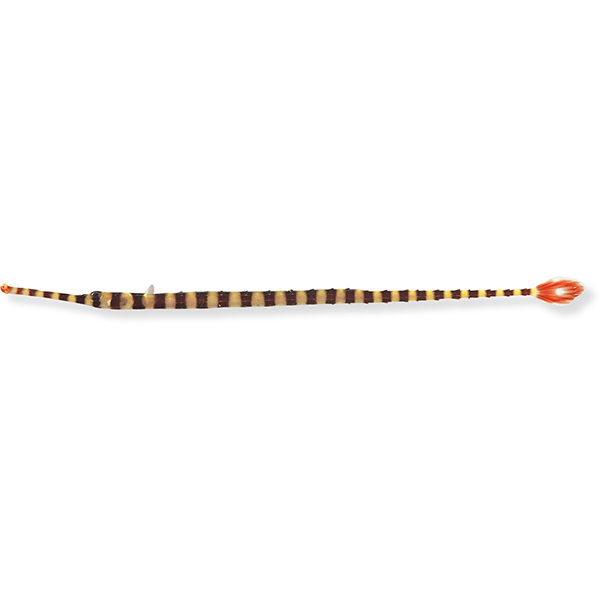 硬骨魚綱トゲウオ目ヨウジウオ科に属する海水魚。伊豆半島以南の太平洋沿岸、山口県の日本海沿岸、太平洋、インド洋に分布する。体が白くて、吻(ふん)端から尾びれ基底までの間に21~37本の暗褐色の横帯があることで他種と簡単に区別できる。吻は長くて、目の後縁と胸びれ基底中央までの距離より長い。各体輪(体を覆う環状の骨板)の隆起の後端は棘(きょく)状。第1体輪は著しく長く、第2体輪のおよそ2倍ある。卵はゼラチン質の物質で包まれて雄の腹面に産み付けられるが、育児嚢(のう)はほとんど発達しない。水深56メートル以浅のサンゴ礁や岩礁の隙間(すきま)や穴のなかで単独あるいはつがいでゆっくり遊泳し、ときには穴の天井で腹を上にして静止している。体長は18センチメートルほどになる。観賞魚として人気がある。