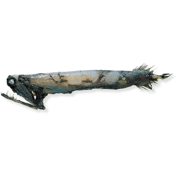 硬骨魚綱ワニトカゲギス目ホウキボシエソ科に属する海水魚。岩手県沖、熊野灘(くまのなだ)、九州・パラオ海嶺、沖縄舟状(しゅうじょう)海盆、小笠原諸島海域、太平洋、インド洋、南シナ海、大西洋、熱帯・亜熱帯海域に広く分布する。体は少し延長し、側扁(そくへん)する。吻(ふん)は著しく短く丸い。目が頭の前端近くにある。目の下方と後方にそれぞれ1個の発光器がある。口は著しく大きく、頭長とほとんど同長。下顎(かがく)に大きな牙状の歯がある。下顎にひげがない。背びれと臀(しり)びれは体の後端近くにある。下顎と喉をつなぐ靱帯(じんたい)を使ってとらばさみのように口を閉じて餌(えさ)を捕らえる。その時、水の抵抗を少なくするために、口の下面に膜がない。水深900~3900メートルの深海域に生息する。体長は25センチメートルほどになる。