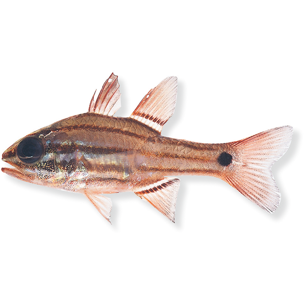 硬骨魚綱スズキ目テンジクダイ科コミナトテンジクダイ亜科スジイシモチ族に属する海水魚。太平洋岸では茨城県から南西諸島、日本海岸では島根県から九州北岸、および朝鮮半島南岸、台湾、中国、フィリピン諸島、オーストラリア沿岸など西太平洋の海域に分布する。体は長楕円(ちょうだえん)形で側扁(そくへん)し、体高は体長の3分の1よりすこし高い。頭長はおよそ体高に等しい。目は大きく、眼径は吻長(ふんちょう)より大きい。口が大きく、上顎(じょうがく)の後端は目の中央下を越える。上主上顎骨はない。上下両顎に犬歯状の歯がない。前鰓蓋骨(ぜんさいがいこつ)の腹縁に鋸歯(きょし)がある。背びれは胸びれ基底上方から始まり、2基でよく離れ、第1背びれは7棘(きょく)、第2背びれは1棘9軟条。臀(しり)びれは第2背びれ起部下方のやや後方から始まり、2棘8~9軟条。胸びれは14~15軟条。頭部と体の鱗(うろこ)は櫛鱗(しつりん)で、側線有孔鱗数は28~29枚。鰓耙(さいは)は上枝に2~3本、下枝に11本が並ぶ。尾びれの後縁は二叉(にさ)する。体色は淡桃色で、側面に4本の鮮明な暗赤褐色の縦帯がある。第1帯は目の上縁から尾柄(びへい)の後部まで、第2帯は吻端から目を横切って体の中央部を通り、尾柄の後部まで、第3帯は上顎の先端から目の下縁を通り、胸びれ基底を横切って尾柄の後縁近くまで、そして第4帯は下顎から臀びれ基底の後端まで伸びる。いずれの縦帯も尾びれの基底まで達しない。尾びれの基底の中央に瞳孔(どうこう)大の黒色の円斑(えんはん)があり、第2帯につながらない。各ひれは淡橙(たんとう)色で、第2背びれと臀びれの基底近くに沿って暗赤色帯がある。水深10メートル以浅の沿岸の岩礁域や内湾の転石域に単独または小群ですむ。産卵や求愛行動中はつがいで、雄が卵塊を口にくわえ、孵化(ふか)するまで保護する習性がある。全長14センチメートルほどになる。