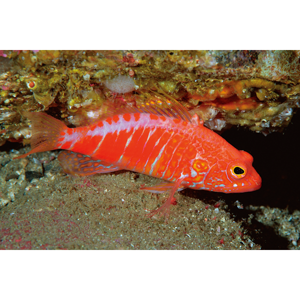 硬骨魚綱スズキ目ハタ科ハナダイ亜科に属する海水魚。伊豆大島、八丈島、高知県柏島(かしわじま)、沖縄県伊江島(いえじま)と久米島(くめじま)、モーリシャス島など太平洋とインド洋に分布する。体は楕円(だえん)形で、側扁(そくへん)し、体長は体高の2.7~2.9倍。上顎(じょうがく)の後端は眼窩(がんか)の後縁下をわずかに越える。両眼間隔域は狭くて平坦(へいたん)。上顎の歯は絨毛(じゅうもう)状の歯帯で、前方ほど幅が広く、前方と内側の歯ほど大きい。下顎の歯は絨毛状の歯帯で、側中央部に2本の犬歯がある。鋤骨(じょこつ)(頭蓋(とうがい)床の最前端にある骨)と口蓋骨に小さい歯の歯帯があり、鋤骨ではV字形。主鰓蓋骨(しゅさいがいこつ)には扁平(へんぺい)な3本の棘(きょく)があり、中央棘はもっとも大きく、最上棘は小さくて、皮下に埋没する。前鰓蓋骨の後縁は鋸歯(きょし)状、下縁に3本の前向きの棘がある。体は櫛鱗(しつりん)で覆われ、頬(ほお)部、前鰓蓋骨後縁を除く鰓蓋部および項部(背びれ起部より前の後頭部)を除き無鱗。背びれと臀(しり)びれの基部に小鱗がある。側線有孔鱗数は29枚。背びれ起部から側線までに3枚、臀びれ起部から側線までに10枚の鱗(うろこ)が斜めに並ぶ。背びれ棘は強くて、第3棘はもっとも長く、第1棘と第2棘はきわめて短い。第3棘~第8棘の先端直後の鰭膜(きまく)は伸長し、第3棘では糸状で著しく長い。臀びれの軟条部の縁辺は丸い。尾びれの後縁は截形(せっけい)(後縁が上下に直線状)で、第2軟条はわずかに伸長する。胸びれの下部軟条の先端の鰭膜は深い欠刻(切れ込み)がある。腹びれの第2軟条は著しく長い。体は鮮赤色で、頭部は多数の不規則な形の赤く縁どられた黄色斑(はん)で覆われる。鰓蓋の上には黄色で縁どりされた、眼径よりわずかに小さい赤色の眼状斑がある。上顎の背縁に沿って3個、前鰓蓋骨の隅角(ぐうかく)部に1個の白色小斑点が1列に並ぶ。虹彩(こうさい)は赤くて、黄色や黒い放射状斑がある。体の後半部の側線から背腹に多数の白色の帯状斑が出て、上部ではすべて体の背縁に、下部では一部で腹縁に達する。背びれ、臀びれ、尾びれおよび腹びれは赤色から淡赤色で多数の黄色斑紋がある。胸びれは赤色で基底に3個の白色斑がある。最大体長は4.8センチメートル。水深35~70メートルのサンゴ礁上や岩礁のガレ場に生息し、ダイバーによって観察されることがある。