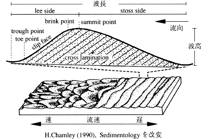 一方向に流れる水流によりつくられるリップルで,波長は60cmより小さい。水流リップル,流れリップルとも。低領域の流れで,0.6mm以下の砂に形成される。流速が大きくなるとデューンまたは平滑床へと移行。断面形は非対称で,上流側斜面(stoss side)は緩やか,下流側は急でほぼ堆積物の水中安息角を示す。下流側斜面(lee side)で堆積物がなだれ落ちることにより下流へ移動する。流速が速いほど峰線が湾曲するようになる。峰線の形状によって,直線状カレントリップル(straight crested current ripple),波曲状カレントリップル(undulatoryまたはsinuous current ripple),舌状カレントリップル(linguoid current ripple)に分類される。