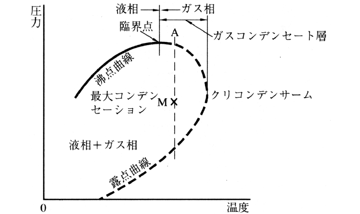 臨界点以上の温度において,露点曲線の外側ではガス相だけが存在する。貯留層内の温度・圧力が高い場合,地表条件下では原油であるはずのものも,層内でガス状を呈し,本来のガスと混合状態にあるものをコンデンセートガスという。A点でのガス相も圧力が低下し,露点曲線を横切ると液相が発生する。このような液相をコンデンセートまたはコンデンセート油という。M点での圧力下で液量は最大となる。
