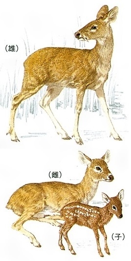 哺乳(ほにゅう)綱偶蹄(ぐうてい)目シカ科の動物。朝鮮半島、中国の揚子江(ようすこう)流域で、アシの茂みや低木地帯に生息する小形のシカである。体高45~55センチメートル、体重9~11キログラム。シカの仲間であるが角(つの)はなく、上あごの犬歯が牙(きば)状になっており、とくに雄では刀状に曲がった犬歯が口外に突き出ている。尾は短く、毛色は黄褐色。ひづめの幅はわりに広い。単独またはつがいですむことが多い。シカ類中では多産で、5、6月に1産1~3子を産み、ときに7子をみることもある。子の毛色は暗褐色で、背に小さな白斑(はくはん)がある。発情期は晩秋から初冬で、この時期の雄は牙を振るって闘争する。アシやその他の植物を食べ、寿命は飼育下で約10年である。