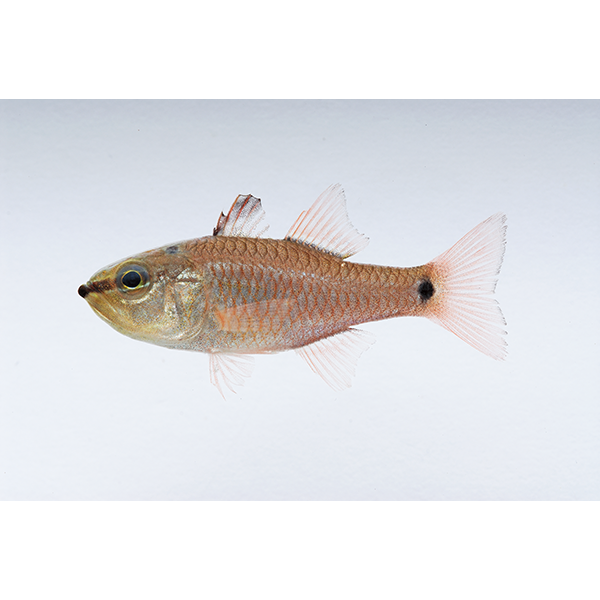 硬骨魚綱スズキ目テンジクダイ科コミナトテンジクダイ亜科スジイシモチ族に属する海水魚。伊豆大島、千葉県館山(たてやま)湾から屋久島(やくしま)、南西諸島、済州島(さいしゅうとう)(韓国)、台湾、フィリピン、ニュー・カレドニアなど西太平洋の海域に広く分布する。体は中庸の長楕円(ちょうだえん)形で側扁(そくへん)し、体高は体長の3分の1よりわずかに高い。頭長はおよそ体高に等しい。目は大きく、眼径は吻長(ふんちょう)より大きい。口は大きく、上顎(じょうがく)の後端は目の中央下に達する。上主上顎骨はない。上下両顎には犬歯状の歯がない。前鰓蓋骨(ぜんさいがいこつ)の隆起線には鋸歯(きょし)がないが、腹縁には鋸歯がある。背びれは胸びれ基底上方から始まり、2基でよく離れ、第1背びれは7棘(きょく)、第2背びれは1棘9軟条。臀(しり)びれは第2背びれ起部下方のやや後方から始まり、2棘8軟条。胸びれは15軟条。頭部と体の鱗(うろこ)は櫛鱗(しつりん)で、有孔側線鱗数は26枚。鰓耙(さいは)は上枝に7本、下枝に21本。尾びれの後縁はわずかにくぼむ。体色は桃赤色で、腹側部で淡い。上顎先端から目に達する黒色の縦帯と、頭頂部に左右1対(つい)の黒色の小円斑(えんはん)がある。下顎の先端は黒い。尾びれの基底中央部に黒色斑がある。背びれの前部から上部にかけて黒く、第2背びれと臀びれの基底に沿って黒色帯がある。