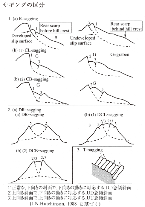 山地にみられる変位現象。初出はU.Zischinsky(1966)で,オーストリアのアルプス山地斜面の深層に根ざした大規模地すべりや岩体のクリープに基づく斜面の変位現象を「Sack-ungen」と呼んだ。J.N.Hutchinson(1988)は山地の山稜付近の斜面にみられる二重山稜・小崖地形・線状凹地・地溝など,明確に地すべりとして分類できない斜面の変形作用に関して総称的に用いるとした。しかし,形態的特徴から次の三つのカテゴリーに分けられている。1)地すべり運動の初期状況と関係した単一斜面に発生するサギング:a.回転(本来円形の)運動を伴うタイプ(R-sagging),b.顕著な円形を示さない複合タイプ(C-sagging)で,ⅰ)傾いた変形面をもったもの(CL)と,ⅱ)二つの平面から構成されるもの(CB)とがある。2)尾根の拡大を導く二つの地すべり運動の初期状況と関係して両側斜面に発生するサギング:a.本来の円形の回転運動を伴うタイプ,b.明らかに非円形の複合タイプで,ⅰ)傾いた変形面をもったもの(DCL)と,ⅱ)二つの平面から構成されるもの(DCB)とがある。3)複数のトップリングと関係したサギング(T-sagging)。 (次ページ図)