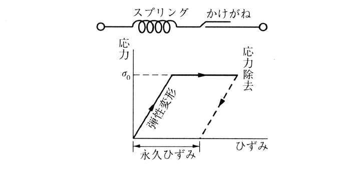 変形特性からみた物体のレオロジーモデルの一つ。サン・ブナン固体,サン・ブナン塑性体,完全塑性体などとも。スプリングとかけがね(スライダー)とを直列につないだ模型で表現される。すなわち,応力が一定値σ0(降伏値)以下では弾性変形を示すが,応力が増加して降伏値に達した後はその応力のまま永久歪みが進行する。したがって応力σと歪みεとの関係は,γを弾性率とすると降伏値以下では,ε=σ・1/γ,降伏値に達した後は,ε>σ・1/γとなる。応力を除去すると,弾性変形による歪みは回復するが,流動による永久歪みは回復せずに残る。
