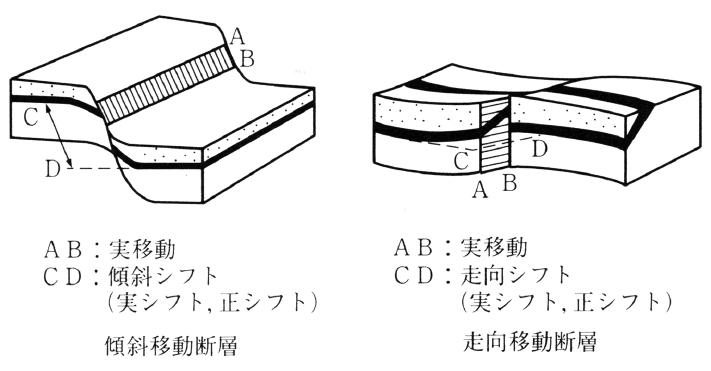 断層によって引きずり(drag)が生ずるときは,両盤の全体としてのずれが断層面上でみられるずれよりも大きい。この場合,引きずりによる変形部分の外側で測った二つの地層間の距離をシフトといい,実移動と平行な方向で測ったものを実シフトまたは正シフト(net shift),実シフトの断層面の走向方向成分を走向シフト(strike shift),傾斜方向成分を傾斜シフト(dip shift)という。