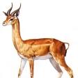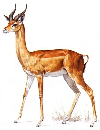 哺乳(ほにゅう)綱偶蹄(ぐうてい)目ウシ科の動物。エチオピアからタンザニアまでのアフリカ東部に分布し、茂みが点在する乾燥した草原や半砂漠に生息する。肩高90~105センチメートル、体重35~50キログラム。角(つの)は雄にだけあり、長さ25~44センチメートル。頸(くび)が長く、体上面は濃い栗(くり)色または赤褐色で、側面は淡く下面は白色。単独か、つがい、ときに3~10頭の小群で暮らし、アカシアなどの葉や芽、若い枝を食べる。しばしば後ろ足だけで立ち上がり、高さ2メートルぐらいにある葉をむしる。ほとんど水を飲まずに生活できる。子は、雨期になって若葉が出るころ生まれる。1産1子。頸が長いため、敵の接近をすぐ感知するが、走るのはガゼルほど速くなく、近年乱獲により急激に数が減っている。