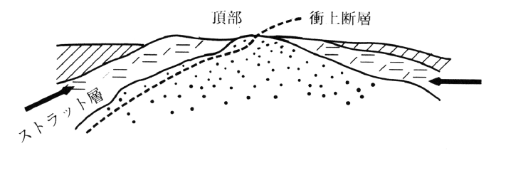 褶曲の進行する過程で,背斜頂部のストラット層(strut bed, 横圧力を支える層の意)が侵食されると,継続する横圧力のもとで,ストラット層の下位層(剪断力に弱い頁岩や石灰岩層)中に低角度の断層が生じ,ストラット層を含む上盤が侵食された頂部に向かって衝上する現象。横圧力がさらに加わると,上盤は侵食された地表面を滑動する。これを削剝衝上といってストラット衝上と区別する。参考文献:P.C.Badgley(1965) Structural and tectonic prin-ciples, Harper & Row