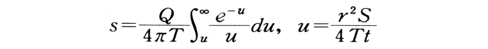 C.V.Theis(1935)が提唱した非平衡式で,揚水試験結果の解析に最もよく用いられる。等方・均質な被圧帯水層が水平・無限大に分布し,地下水流が井戸に向かう水平一様流だけであると仮定すると,ある観測点での任意の時刻の水位低下量sは,ダルシーの法則を前提として,次式で与えられる。