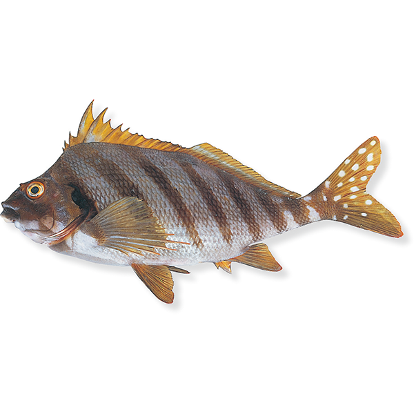 スズキ目タカノハダイ科の海水魚。体長 30cm内外。体は側扁し,口と歯は小さい。体は淡褐色で腹面は白く,側面に濃褐色の9本の斜走帯がある。尾鰭には白色斑が散在する。近海の岩礁にすみ,本州中部以南,朝鮮,南シナ海などに分布する。食用。