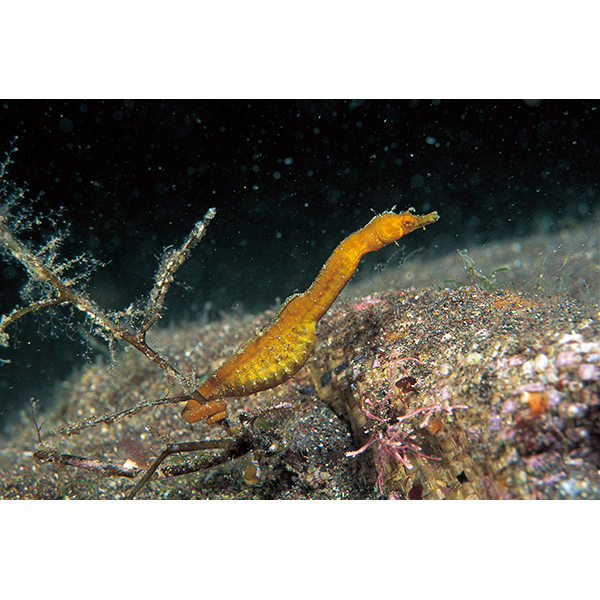 硬骨魚綱トゲウオ目ヨウジウオ科に属する海水魚。日本では伊豆諸島、小笠原諸島、相模(さがみ)湾以南、山口県の日本海側など、ほかにベトナム、ニュー・カレドニアなど太平洋に分布する。尾びれがなくて、尾部で他物に巻き付くことができること、育児嚢(のう)は完全な袋状であることなどでタツノオトシゴ類の仲間にされていたが、頭が体と直角に曲がらずほとんどまっすぐで、冠状突起が発達しないことなどで、最近の研究ではヨウジウオの仲間に入れられている。体が細長く伸びてヨウジウオ類の特徴をもつが、尾部の先端が曲がる。背びれの基底は著しく盛り上がる。体には多くの皮弁があるが、数や大きさにかなりの個体変異がある。体色は黄褐色、茶褐色など生息場所によって著しい変異がある。浅い岩礁域の砂底や転石に生えている海藻類に巻き付いてすむ。雄には育児嚢があり、その中にいる稚魚は尾びれをもち、産出後しばらくは浮遊生活をする。体長は10センチメートルほどにしかならない小型種である。