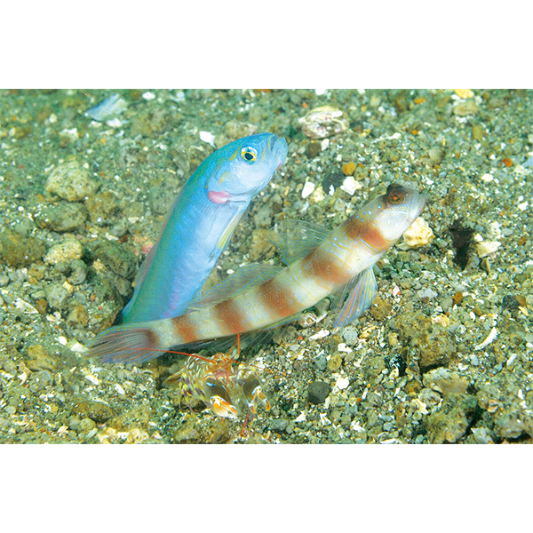 解説 / 沿岸の貝がらまじりの砂れき底にすみます。雌雄1対でいることが多く、テッポウエビ類がほったあなで共同生活をしています。