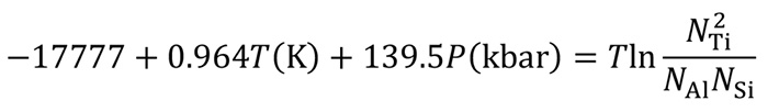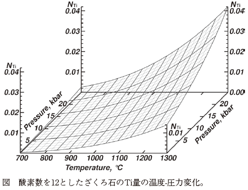 NTi, NAl, NSiは酸素数を12としたざくろ石中のTi, Al, Si量。ざくろ石のTi量は変成作用の温度圧力に依存する(図)。図から温度と圧力の関係を読み取る場合,ざくろ石の化学組成がXMg=0.4〜0.6,Ca/(Fe+Mg+Ca)≤0.05であることに注意する必要がある。参考文献:T.Kawasaki et al. (2016) J. Min. Petr. Sci., Vol.111: 226