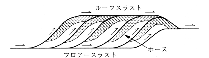 覆瓦状構造の一種で,上限をルーフスラスト,下限をフロアースラストで境され,そのなかで同一層準の地層がより小規模なスラストによって瓦を斜めに重ねたように繰り返しているもの。デュープレックス形成によって,そのなかの地層は結果的に側方に短縮し,全体として厚くなる。デュープレックスは,ピギーバック型のスラストシーケンスで,スラストが上方に切り上がるランプの位置で上盤が下盤の地層を次々とはぎ取っていくときに形成される。デュープレックス内の個々のブロックはホースと呼ばれ,ホースは見かけ上の下位に重なっているものほど後に形成されている。デュープレックスは,個々のホースの長さとその変位量との関係によって,後背地傾斜デュープレックス(hinterland-dipping duplex),背斜状累重(an-tiformal stack),前縁地傾斜デュープレックス(fore-land-dipping duplex)の3種類に分けられる。単にデュープレックスという場合には,前記の衝上性のものを指すのが普通である。伸張断層に伴う伸張デュープレックスや,横ずれ断層に伴う横ずれデュープレックスも存在する。