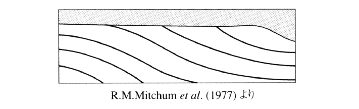 堆積シーケンスの上面での一形態。堆積時にすでに傾斜して形成された地層が頂面において,次々に陸側に向かい尖滅する現象。頂接とも。頂面では,無堆積あるいは軽微な侵食の場となる。プログラデーションを示す地層の上面に特徴的に認められる。