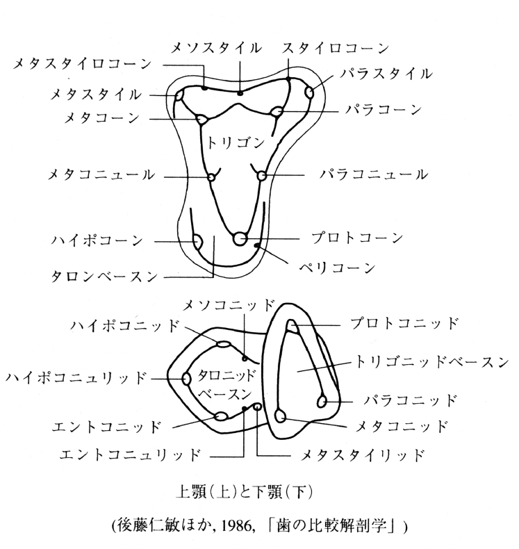 G.G.Simpson(1936)が,哺乳類の三結節タイプの大臼歯に名づけたもので,進化的意味を含めず,大臼歯の機能だけを重視した概念。三結節説は,当時,哺乳類の大臼歯の進化仮説として賛否両論があり,確定していなかったことが大きな理由。tribosphenicはギリシア語のtribos(摩擦)+sphen(楔)。上顎大臼歯の三角形状の部分(トリゴン)と,下顎大臼歯の三角形状の部分(トリゴニッド)の縁の隆線が擦れ合い,食物を切断する(sphen)。一方,上顎の舌側咬頭(プロトコーン)が下顎のトリゴニッドの遠心に存在する台(タロニッド)と嚙み合い,食物をすりつぶす(tribos)。この二つの機能が,トリボスフェニック型大臼歯の特徴。少なくとも正獣類・後獣類の複雑な大臼歯はトリボスフェニック型大臼歯から進化した。