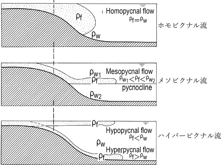 湖や海などの停滞水塊に河川などの供給路が達したとき,供給路内の懸濁した水が停滞水塊の水に対して密度が高い場合,流入した水は停滞水塊の底面斜面上を流下する。このような流れをハイパーピクナル流という。運搬機構は混濁流であるが,洪水流が次第に強くなることによって砕屑物の粗粒化が起こり,基底付近に逆級化構造を伴うことがある。その上位はタービダイトと同様に正級化構造となる。また,最上部の細粒砂からその上位の泥質部にかけて木質物質などの陸源性有機物に富む。ハイパーピクナル流で堆積した地層をタービダイトと区別してハイパーピクナイト(hyperpycnite)と呼ぶ。一方,供給路内の懸濁した水の密度が停滞水域の密度より低い場合は,流入後に水域の上面を流れるハイポピクナル流(hypopycnal flow)となる。密度が同じ場合は水域内部に広がるホモピクナル流(homopycnal flow),水塊下部の密度が高く上部が低い場合にはその境界(pycnocline)を流れるメソピクナル流(mesopycnal flow)となる。参考文献:Mulder et al.(2001) Sedimentology,48: 269