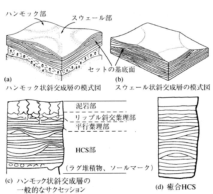 波長1~数m,波高10cm前後の,10°以下で緩やかに傾く波状の堆積構造。HCSと略されることが多い。上に凸の頂部をハンモック部,下に凸の谷部をスウェール部と呼ぶ。層理のセットの基底面は侵食面で,この面に平行に層理が発達する。また,粗粒シルトから細粒砂に発達し,雲母片や植物片などが葉理の基底に集まることが多い。小丘がランダムに配列する三次元的な形態である。一般的なサクセッションは,下からソールマークや貝殻片などのラグ堆積物がみられる基底面,HCS部,平行葉理部,リップル斜交葉理部,泥岩部で,供給源からの距離などによって変わる。周期が長く,流速の大きな振動流またはこれに弱い一方向流が重なった複合流によって形成される。地層では浅海の波浪が卓越した場での堆積物に多くみられる。泥岩層に挟まれる場合は,静穏時波浪限界より深く暴浪時波浪限界より浅い所で,嵐による大波で形成されたと考えられる。浅い場で堆積したものほど泥岩層の量・頻度が少なくなり,侵食によって泥岩が全部削られると,砂岩同士が重なった癒合ハンモック状斜交成層になる。また浅い所では,ハンモック部が削られてスウェール部のみからなるスウェール状斜交成層(SCS)が多くなる。HCSはJ.C.Harms(1975)が名称を提唱してから,ストーム堆積物および水深の指標として注目されるようになった。参考文献:J.C.Harms(1975) SEPM Short Course 2