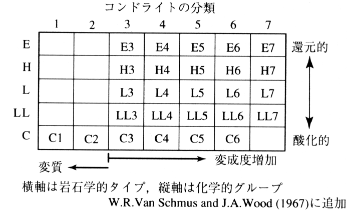コンドライトの分類法の一つ。コンドライト隕石は,まず鉄の酸化還元状態に基づくユーリー-クレイグ図により五つの化学的グループに区分される(E・H・L・LL・Cコンドライトグループ)。さらに各グループは変成の程度,つまり組織の特徴から5段階(すなわち岩石学的タイプ3~7)に区分される。ただし炭素質隕石は揮発性成分の量によりC1・C2に分けられるので,最終的にはコンドライトは五つの化学的グループと7段階の岩石学的タイプに基づき26のタイプに区分される。ただし,岩石学的タイプ7に属する隕石はコンドルールを含まず,原始的エコンドライトに分類される場合もある。