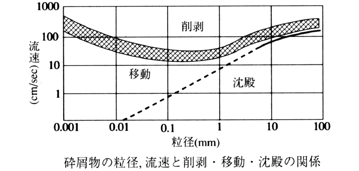 F.Hjulström(1939)による,平均流速と粒径ごとの砕屑物の削剝・移動・沈殿の関係を示すダイヤグラム。図は細粒砂が削剝されやすいこと,シルト・粘土は粘着性のため削剝されにくいこと,粒径の小さい粒子は移動しやすいことを示す。