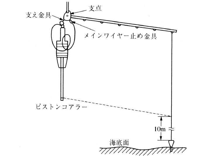 底質を柱状に数m~数十m採取する器具。B.Kullenberg(1947)発明。現在使用されるのは改良型。ピストン式柱状採泥器とも。採泥器本体,パイロット採泥器,両者を連結するレバー装置,着底確認装置(ボール・ブレーカーまたはピンガー)からなる。パイロット採泥器が着底すると,レバー装置がはずれ,採泥器本体が数m自由落下し,海底に突き刺さる。このとき,ピストンは海底面に止まり,パイプが貫入するため吸引力を生じ,底質を吸い込んで長い柱状試料を得ることが可能。試料は気候変化・堆積作用・続成作用の研究に使用。