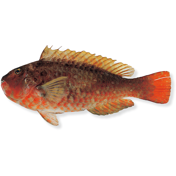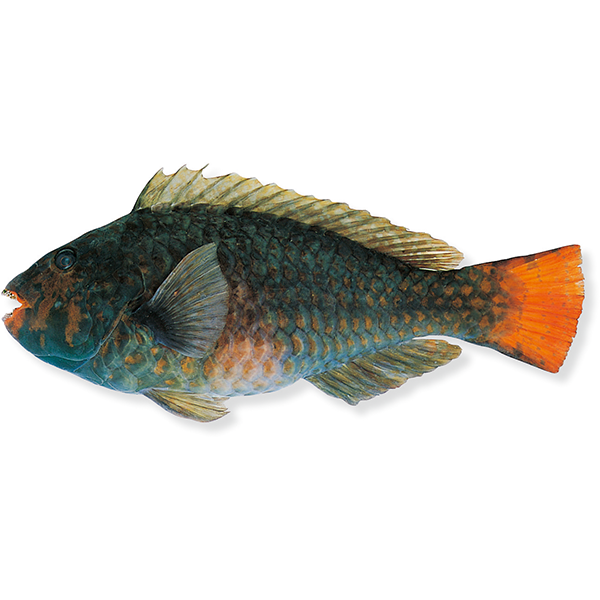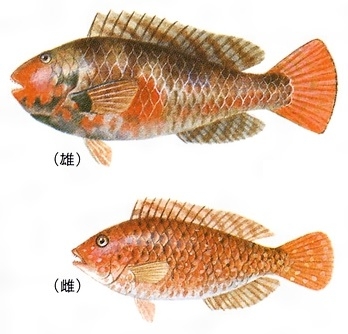 房総半島および兵庫県香住(かすみ)地区以南から南西諸島、小笠原諸島、韓国釜山(プサン)、台湾に分布する。鱗(うろこ)は大きく、側線鱗(そくせんりん)は23枚前後。側線は体の背縁寄りに走り、尾柄(びへい)の前端近くで急に側中線を通る。尾びれの後縁は緩やかに曲がる。雄はやや青みを、雌は赤みを帯び、体側に青色またはバラ色の複雑な斑紋(はんもん)が散在する。体長40センチメートルに達する。水深10メートル前後の岩礁域などに生息する。産卵の盛期は夏で、沖合いに数百の雌が集まり、その近くで雄が縄張りをつくる。満潮が過ぎるころに、つがいで産卵する。熟卵は直径0.6ミリメートルと小さく、25℃の水温中では24時間で孵化(ふか)する。孵化後まもない仔魚(しぎょ)も小さく、全長1.6ミリメートルぐらいである。1年で全長14センチメートル、3年で29センチメートル、5年で36センチメートルほどに成長する。あごの歯が強いうえ、のどにも頑丈な歯があるので、海藻、石炭藻、エビ・カニ類、造礁サンゴ(ポリプ)などをかみ砕いて食べる。とくにサンゴ片のように消化できないものは、かみ砕いたのち口の外に吐き出す。水温15~23℃のときに餌(えさ)を活発に食べる。動作はやや緩慢であり、昼間は潮通しのよい場所でくぼみや溝などを通って遊泳して餌をあさる。夜間は岩礁の割れ目に帰って休息する。