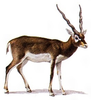 偶蹄目ウシ科の哺乳類。雄の体色が,背側の黒褐色と腹側の白色に明りょうにわかれて,美しいコントラストを見せるインドとパキスタン産のアンテロープ。目の周囲と臀部(でんぶ)も白色。雄はまた,緩やかにらせん状によじれた長さ49~69cmのみごとな角をもつ。雌の体色は黄褐色で,角はない。体長100~150cm,肩高60~85cm,尾長10~18cm,体重25~45kg。草原やまばらに木の生える林に5~50頭の群れですむ。群れは雄1頭と雌およびその子からなり,雄は雌を奪おうとする他の雄としばしば争う。この際,雄は角を誇示することによって相手を威嚇し,多くはこれで勝敗が決まる。暑い日中を避けて朝方と夕方に,おもに草を採食する。群れの結束はかたく,例えば,危険を察知した群れのメンバーは,四肢をそろえて垂直に上方に飛び上がる運動を繰り返し,仲間に知らせる。この運動は仲間に次々と伝わり,ついには群れ全体が一致して走り始める。繁殖期は一定せず,雌の妊娠期間は約6ヵ月。1産1~2子である。