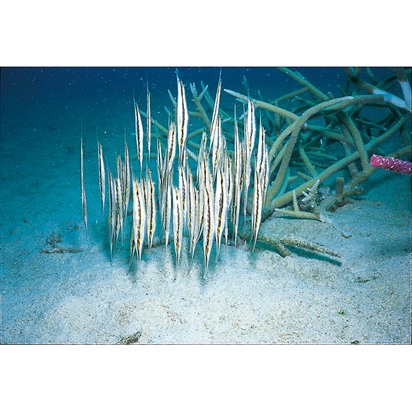 解説 / 体は横にうすく、透明な骨板でおおわれます。サンゴ礁や内湾の浅い海に群れですみます。幼魚はガンガゼやアマモなどの間にかくれる習性があります。