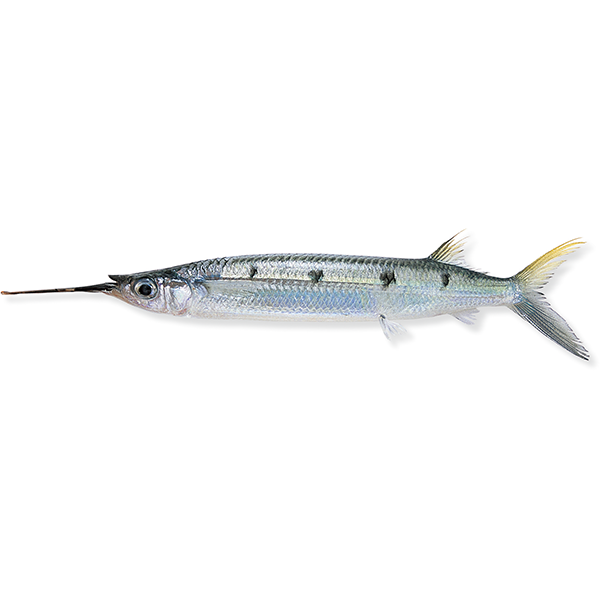 硬骨魚綱ダツ目サヨリ科に属する海水魚。伊豆半島以南、西部太平洋、インド洋、地中海東部の温帯、熱帯海域に分布する。下顎(かがく)は上顎より著しく長い。背びれと臀(しり)びれは体の後部にあってほぼ対位する。体は側扁(そくへん)し、体は高いこと、吻(ふん)の背面に鱗(うろこ)がないこと、体側に4~9個の黒色の斑紋(はんもん)があり、臀びれの基底長は短くて、背びれ基底長のおよそ半分であることなどでほかの種と容易に区別できる。下顎の先端部は赤くない。背びれの先端部と尾びれの上葉は黄色。全長50センチメートルほどになる。沿岸の表層域にすみ、定置網、刺網、釣りなどで漁獲される。刺身、すしだねなどにする。