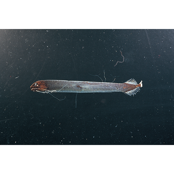 解説 / 深い海を遊泳しています。体全体に小さな発光器があり、下あごに細いひげがあります。