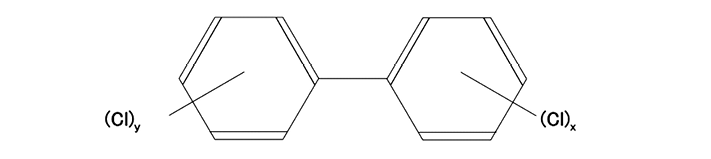 ビフェニルC6H5-C6H5の二つのベンゼン環がもつ10個の水素原子の2~10個を塩素原子で置き換えた化合物の総称で、C12HnCl10-nの一般式で示すことができる。PCBと略記される。