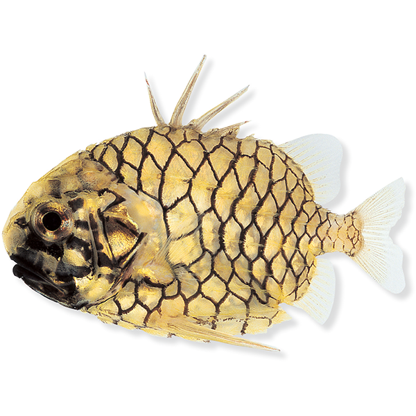 解説 / 下あごの中央に発光器があります。背びれと腹びれのとげは強大です。浅い海の岩礁にすみ、主に甲殻類を食べます。