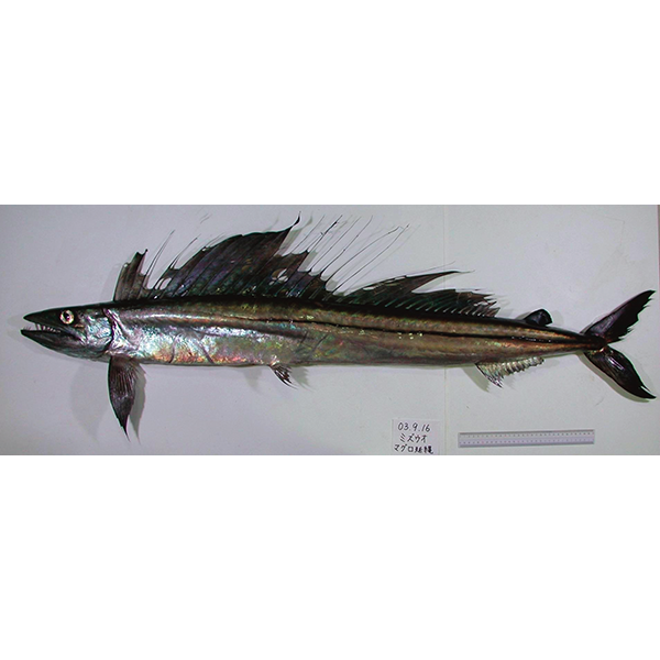 ヒメ目ミズウオ科の海水魚。全長 2m内外。体は著しく延長し,側扁する。吻は長く,先端がとがる。口は大きく,両顎に鋭い歯がある。背鰭は大きく帆状で,その基底は体の背面の大部分を占める。体の背部は暗青色で,十数条の暗色斜走帯がある。腹側は白色。背鰭は基部が暗青色,縁辺部は黒色で,多数の黒点が散在する。深海性(→深海魚)。マグロ延縄にかかるほか,かつて行なわれていたサケ流し網にかかっていた。北海道南岸以南,世界中の海域に分布する。
