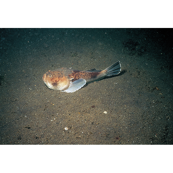 硬骨魚綱スズキ目ミシマオコゼ科に属する海水魚。富山湾、神奈川県三崎(みさき)から東インド諸島、オーストラリアにかけて分布する。頭は大きく、体の3分の1以上ある。尾部は後方に向かうほど側扁(そくへん)するが、頭は逆に縦扁する。頭の背面と側面は骨板で覆われる。両眼は頭の背面にある。両眼間隔域にあるへこみは両眼窩(がんか)の後縁を結んだ線まで延び、前方に向かって著しく広くなる。体は暗灰色で、体側に2個と頭側に1個の大きい黒褐色斑(はん)があり、第1背びれは紫黒色であることなどで、近縁種と容易に区別がつく。名前は頭の黒斑が眼鏡を連想させることに由来するという。水深100メートル以浅の砂礫(されき)底にすむ。下顎(かがく)の中央部に橙色の長い帯状の皮質突起があり、ルアーとして餌(えさ)をおびき寄せるために使用している可能性が高い。体長33センチメートルぐらいになる。まとまって漁獲されることはない。
