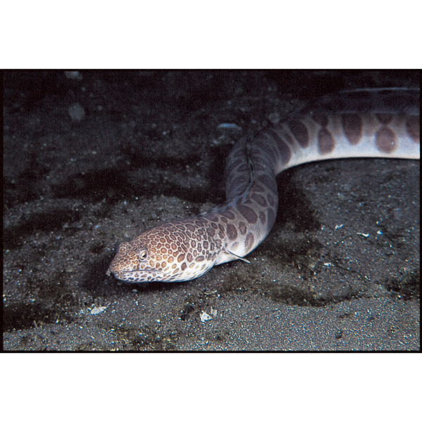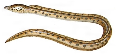 硬骨魚綱ウナギ目ウミヘビ科に属する海水魚。千葉県以南の太平洋沿岸、沖縄本島、東シナ海、小笠原(おがさわら)諸島、南シナ海、南アフリカ、ハワイ諸島など太平洋からインド洋にわたる海域に広く分布する。体はほぼ円柱状で細長い。尾端部は肉質で終わる。尾部の長さは、肛門(こうもん)より前方の長さよりも短い。前鼻孔(ぜんびこう)は吻端(ふんたん)近くの側面に開き、管状に長く突出する。後鼻孔は目の前縁下方の上唇縁辺に開く。上顎(じょうがく)は下顎より前に突出し、後端は目の後縁よりはるか後方まで達する。上下両顎と鋤骨(じょこつ)(頭蓋(とうがい)床の最前端にある骨)に斜め後方に向かう1列の小さい円錐歯(えんすいし)がある。鋤骨歯は目の後縁下方まで並ぶ。前上顎の先端にある3対(つい)の歯は口を閉じると露出する。背びれは胸びれ基部上方から、臀(しり)びれは肛門直後から始まり、尾端まで達しない。尾びれはない。体は黄褐色で、大きくて円い暗褐色の斑紋(はんもん)が2縦列に並ぶ。また、それらの間に同色の小斑紋が不規則に散在する個体もある。頭部と下顎の斑紋は小さくて密集している。背びれと胸びれに円形の暗褐色斑が散在する。生息水深の範囲はきわめて広く、沿岸の水深10~130メートルの砂底または砂泥底にすむ。頭部だけや、全身を砂底から出しているものが観察されている。最大全長は70センチメートルを越える。延縄(はえなわ)、底引網でときどき漁獲されるが、食用価値はない。