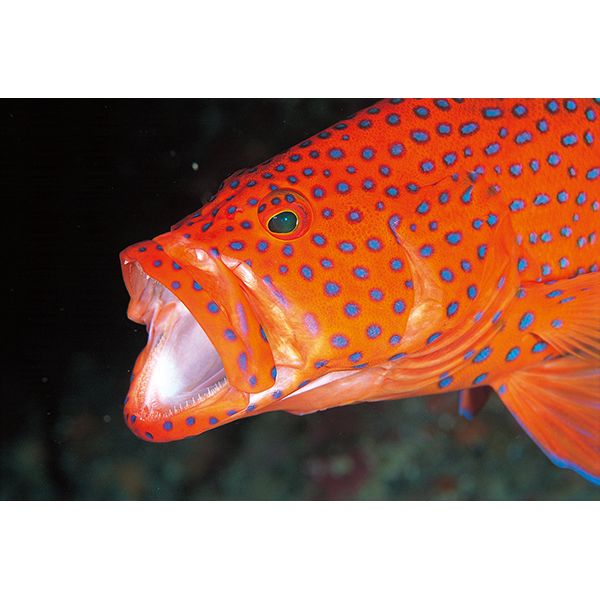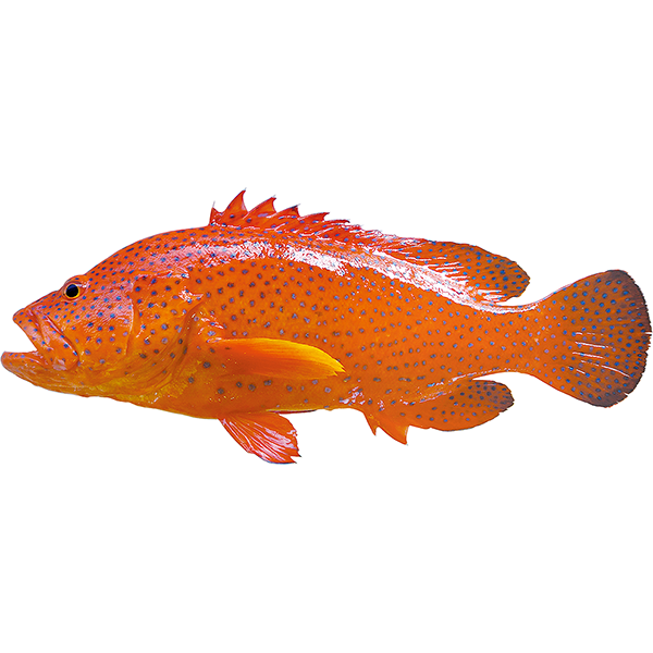 硬骨魚綱スズキ目ハタ科ハタ亜科ハタ族に属する海水魚。八丈島、小笠原(おがさわら)諸島、硫黄島(いおうとう)、駿河湾(するがわん)から屋久島(やくしま)にかけての太平洋沿岸、南西諸島、九州の北西岸、台湾南部、オーストラリア北岸、ミクロネシアなど西部・中部太平洋、インド洋に広く分布する。背びれ棘(きょく)が9本、臀(しり)びれ軟条が9本のユカタハタ類で、赤褐色の体とひれに多数の淡青灰色の円斑(えんはん)が散らばるのが顕著な特徴である。体は長楕円(ちょうだえん)形で、側扁(そくへん)し、体高は頭長よりもすこし低く、体長は体高の2.6~3.0倍。頭部の外郭はほとんど直線状。両眼間隔域は平坦(へいたん)またはわずかに凸状で、その幅はおよそ眼径に等しい。前鰓蓋骨(ぜんさいがいこつ)の縁辺は丸く、細かい鋸歯(きょし)があり、腹縁は厚みがある。間鰓蓋骨と下鰓蓋骨には細かい鋸歯縁がある。主鰓蓋骨の後縁はよく突出し、中央棘は上棘より下棘に近い。上顎(じょうがく)の後縁は目の後縁下に達するか、そこを越える。上下両顎の前端の各側に1対(つい)の犬歯があり、下顎の側面中央部には3列以上の歯がある。鋤骨(じょこつ)(頭蓋床の最前端にある骨)と口蓋骨に幅狭い歯帯がある。背びれは9棘14~16軟条で、棘部の鰭膜(きまく)は深く切れ込む。臀びれは3棘9軟条(まれに8軟条)。尾びれの後縁は円形。胸びれはほとんど上下相称で、17~18軟条。腹びれは肛門(こうもん)に達しない。鱗(うろこ)は櫛鱗(しつりん)で、側線有孔鱗数は47~56枚。主上顎骨は小鱗をかぶる。体やひれは赤褐色で、小さい淡青灰色の円斑で覆われる。胸びれの先端部は橙黄色。背びれ軟条部、尾びれおよび臀びれはしばしば狭い青色の縁辺とその下部に黒っぽい線をもつ。腹びれの縁辺は暗青灰色。稚魚では体は黄色みを帯び、不明瞭(ふめいりょう)な淡青色の斑点があるが、斑点の数は成魚よりも少ない。水深150メートル以浅の透明なよく発達したサンゴ礁域に生息し、おもにサンゴ礁の直上で群れている魚類に底から突進して捕食する。とくにキンギョハナダイを好んで食べるが、一部甲殻類も食べる。最大全長は48センチメートルになる。1尾の優位雄と2~12尾の雌からなるハーレム群を形成する。その群の中に1尾の雌によって守られているいくつかの二次テリトリーがある。