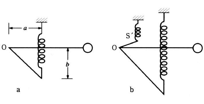 グレー型振子の変形で,長周期上下動振子の一種。振子は図(a)のOを支点として,つるまきばねで上下に揺れる。このつり方での振子の周期は,