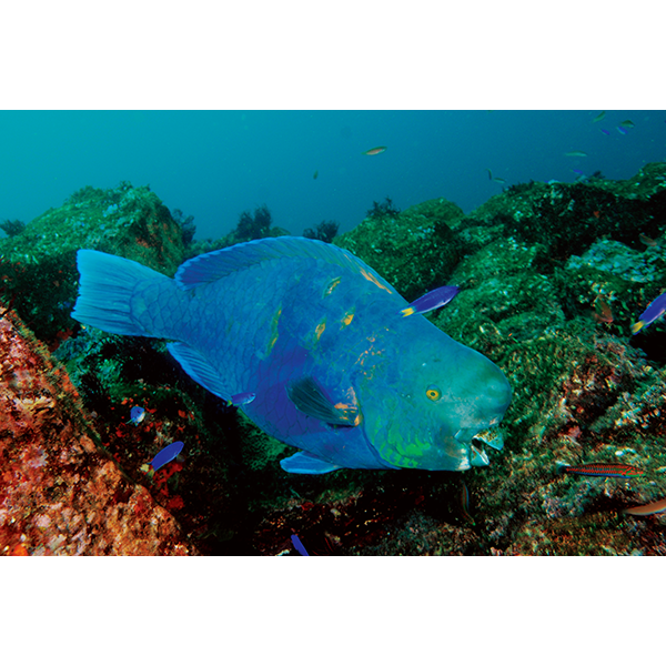 硬骨魚綱スズキ目ブダイ科に属する海水魚。東京湾から南西諸島(琉球列島)にかけての太平洋に分布する。体は楕円(だえん)形で一様に青いのが特徴だが、胸部、背びれおよび胸びれが朱色のものもいる。幼魚、若魚および老成魚では黒みが強い。成魚の雄では額(ひたい)がこぶ状に突き出る。上下両あごの歯は互いに癒合して嘴(くちばし)状になり、大部分がむき出る。背びれの前方の鱗(うろこ)は6枚。ほお部の鱗は2列に並ぶ。全長80センチメートルになる。サンゴ礁や岩場にすむ。昼は中層で数尾が群れをなし夜は岩場で休む。強い歯で造礁サンゴを骨格ごとかじりとって食べる。肉は白くてフライなどにするが、あまり美味ではない。内臓、とくに肝臓にはスナギンチャク類由来のフグ毒より強い猛毒パリトキシンが蓄積されていることがあり、注意が必要である。イシダイの外道(げどう)(狙っているもの以外の魚が釣れてしまうこと)として嫌われる。