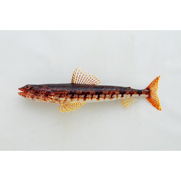 硬骨魚綱ヒメ目エソ科に属する海水魚。千葉県から奄美(あまみ)大島の太平洋沿岸、島根県から九州北西岸の日本海と東シナ海、小笠原(おがさわら)諸島、台湾、ハワイ諸島などの海域に分布する。体高は低く、全体として細長い円筒形で、頭はやや縦扁(じゅうへん)する。吻(ふん)は長さより幅のほうが大きく、吻端は鋭くとがる。前鼻孔(ぜんびこう)の後縁に長いへら状の皮弁(皮質突起)があり、前方へ倒すと前鼻孔の前縁をはるかに越える。口は大きく、上顎(じょうがく)が下顎より前に出る。両眼間隔域はくぼみ、後頭部は骨質状である。目は小さい。上下両顎歯は犬歯状で、矢状の先端をもつ。口蓋(こうがい)部の歯はV字状に並び、前の歯はもっとも大きく不連続群を形成する。舌上にある歯はよく発達する。背びれは13~14軟条(普通は14軟条)、臀(しり)びれは8~11軟条。側線鱗(そくせんりん)数は60~66枚で、側線上方横列鱗数は5.5枚。前鰓蓋骨(ぜんさいがいこつ)上には鱗(うろこ)がない。胸びれは腹びれ起部と背びれの起部を結ぶ線に達する。体は薄赤色で、体側に8~9本の赤褐色の横帯がある。浅海の岩礁やその近辺の砂底に生息する。砂に体を隠し、頭部を水中に出して餌(えさ)を待つ姿勢が観察されている。おもに小さい魚類を食べ、全長約35センチメートルに達する。