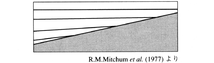 ベースラップの一形態。水平に堆積する新期の地層の層理面が,傾いた下位層との境界面に対して著しい角度で次々と斜交し,ぶつかる状態,あるいは,やや傾斜して堆積した地層の層理面が,さらに傾いた下位層との境界面と平行せず,これと斜交し,ぶつかる状態になっている場合をいう。上位層は下位層に比べて水平的な分布を(ある方向に)広げる。上接とも。連続的な海進=堆積域の拡大に伴って生ずる。オフラップの対語。